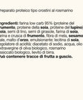 Ingredienti: farina low carb 95% (proteine del frumento, proteine della soia, proteine del lupino), soia, semi di lino, semi di girasole, farina di soia, farina e crusca di frumento, fibra di mela, sesamo, sale, malto d’orzo, emulsionante: lecitina di soia, regolatore di acidità: diacetato di sodio, acqua, olio extravergine di oliva biologico, rosmarino essiccato biologico, lievito di birra. Può contenere tracce di frutta a guscio.