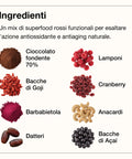 Ingredienti: datteri, cioccolato fondente 70% (pasta di cacao, zucchero di canna, burro di cacao, lecitina di soia, estratto di vaniglia - cacao 70%), anacardi 5%, bacche di goji 3%, lampone 1,5%, barbabietola, acai 1%, cranberry 1%, baobab. Cacao 41% min. Può contenere altra frutta a guscio, arachidi e sesamo