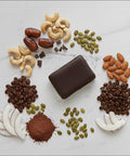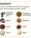 Ingredienti:datteri, cioccolato fondente 70% (pasta di cacao, zucchero di canna, burro di cacao, lecitina di soia, estratto di vaniglia - cacao 70%), proteine da semi di zucca, mandorle 4%, cacao in polvere, cocco rapè, maca 1%, caffè 1%. Cacao 41% min. Può contenere altra frutta a guscio, arachidi e sesamo